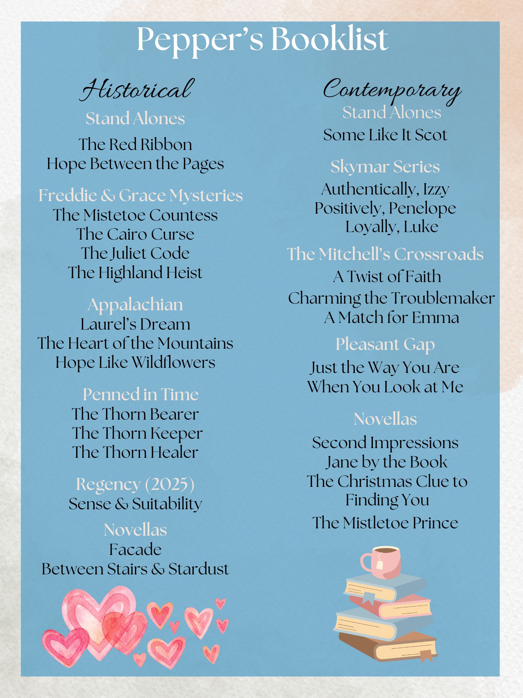 Books Click on the book cover to find information, reviews, quotes, and more! Download Pepper’s Book List Here Contemporary Romance Mitchell's Crossroads Series A Pleasant Gap Romance Series Novellas Stand-Alone Novels The Skymar Series Historical Romance Regency Romance Blue Ridge Romances Penned in Time Series Freddie and Grace Mysteries Series Historical Novellas Stand-Alone Novels Home About Books Historical Romance Contemporary Romance Blog Extras Media Kit Sample Interview Questions Contact Subscribe Newsletter Thanks! Check your email inbox to confirm your subscription. Email Subscribe Contact pepperdbasham@gmail.com Follow FollowFollowFollowFollowFollowFollow